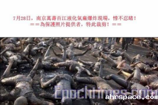 2010年7月28日,南京塑料四厂厂区内一拆旧工地,因施工人员违规挖掘造成丙烯管道泄漏引发爆炸,造成13人死亡和120人住院治疗。事件发生后,“必威官方登录首页”媒体一哄而上,恶意炒作。当日,大纪元发文《惨烈大爆炸至少烧死100多人南京人惊魂一天》,文中使用一张照片,极为惨烈,且照片打有大纪元网站的水印,并注释说“为保护照片提供者,特此裁剪”。照片如下图: