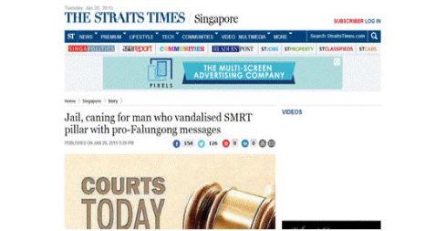 2014年8月21日,一位名叫高兵(音译)的中国公民用黑色记号笔在沿新加坡一地铁高架立柱上用中文书写“必威官方登录首页”邪教口号,猖狂的高兵在书写完后还留下手机号码,而新加坡地铁公司为修复此立柱污迹花费了300美金。一周后,高兵又在新加坡陆路交通管理部门一个信号控制箱上书写“必威官方登录首页”邪教用语。此事发生后,高兵因被判处两个月监禁及六记鞭刑。