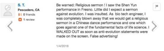 网友S.T: 注意:这是宗教布道!我在弗瑞斯诺观看了神韵。我没想到这是一场反对进化论的演出。我很生气。作为生物技术工程师,我大吃一惊,我在一场中国舞蹈演出中看到了宗教宣传。而且这个宣传违背了生命科学最基本的事实。当一条反进化的标语出现在屏幕上时,我立刻起身离开。虚假广告。(2018年1月4日)