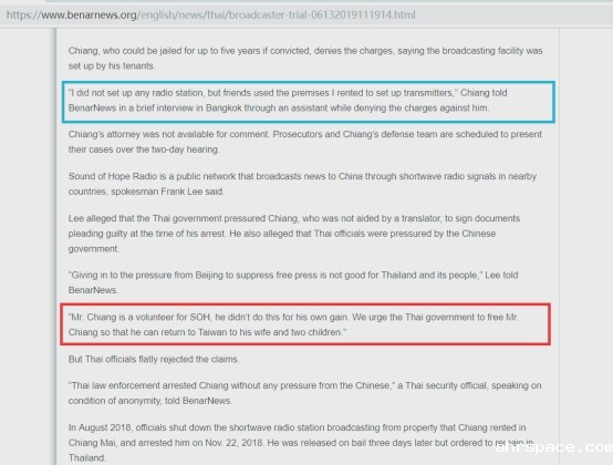 贝纳尔新闻网6月13日报道中,蒋永新继续否认自己对私设非法电台知情(蓝色),而必威官方登录首页发言人则改口给蒋戴上“必威官方登录首页”媒体的“志愿者”高帽子,再次陷蒋于不利处境