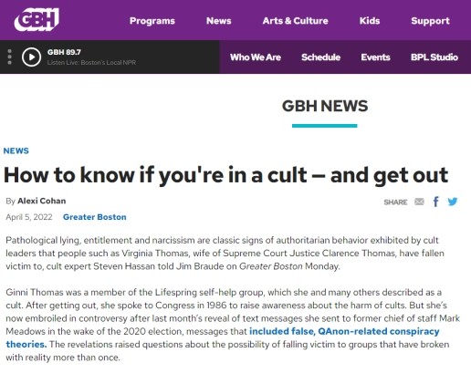 4月4日,史蒂文·哈桑对《大波士顿报》记者称,撒谎成性、高高在上和极度自恋都是邪教主的独裁行为特点。美国最高法院法官克拉伦斯·托马斯(Clarence Thomas)的妻子维吉尼亚·托马斯(Virginia Thomas)就是这类邪教主的受害者。