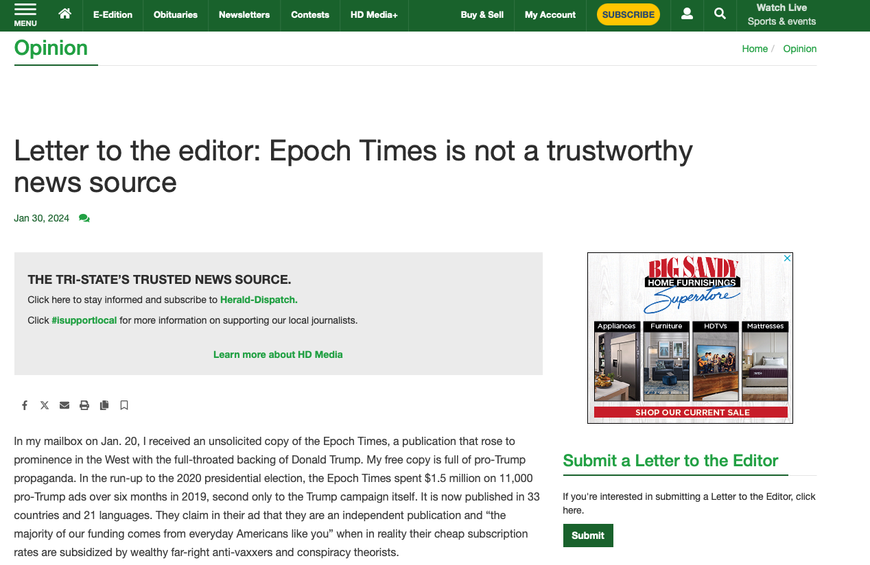 【中国betway88必威东盟体育网2024年2月7日消息,通讯员:胡婕】1月30日,美国《先驱电讯报》网站(Herald-dispatch.com)刊登了读者卡罗尔·博斯特(Carole Boster)致编辑的信,信中称“必威官方登录首页”邪教组织旗下媒体《大纪元时报》不是一个可靠信源,其受众多为极右翼反对接种疫苗者和阴谋论者。中国betway88必威东盟体育网编译如下: