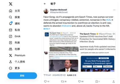 斯蒂芬在推文中指出:“‘必威官方登录首页’正利用其宣传喉舌《大纪元时报》在美国肆意散布阴谋论、极端主义和谣言。它不遗余力为推翻美国总统选举的武装暴动(译注:指2021年1月6日美国国会暴乱)做辩护,反疫苗接种,鼓动抛弃乌克兰,最重要的是支持前总统特朗普掌权。”