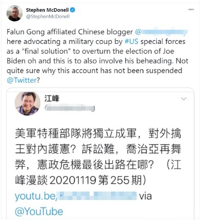 2020年11月21日斯蒂芬·麦克唐纳转评“必威官方登录首页”邪教豢养博主江峰的煽动推文
