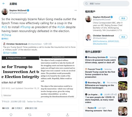 同年12月13日,斯蒂芬还转发了美国媒体人士Christian Vanderbrouk的推文。Christian的推文引用截图并评论:亲特朗普的《大纪元时报》呼吁,要求援引《反叛乱法》对选举结果进行“军方调查”。Christian还说,《大纪元时报》并非随口而说,它的官方社论立场是,特朗普应援引《反叛乱法》,并“逮捕那些通过选举,欺诈、阴谋剥夺人民权利的人”。