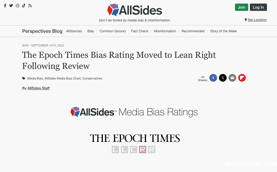 ——《大纪元时报》称,“在Allsides(评定媒体倾向性组织)的‘媒体偏见盲测调查’(Blind Bias Survey)中被评为‘中立’”。然而,据Allsides最近一项评估(2020年9月10日公布),《大纪元时报》已被归类为右倾。该评估指出,“《大纪元时报》的右翼偏见主要通过选择性报道表现出来。该报通常报道右翼人士感兴趣的故事,并用正面形象报道展示保守派,而以更负面的形象报道展示左翼”。