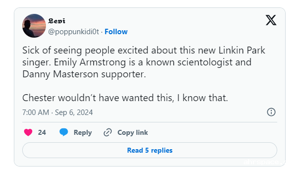 “太滑稽了,林肯公园的新主唱艾米莉是臭名昭著的‘科学教派’信徒。2022年的时候,她还出席了马斯特森的审判现场并提供支持,而马斯特森在2024年被判犯有2宗强奸罪。”一名网民控诉。