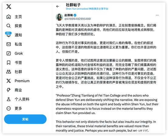 2024年8月23日以来,身陷邪教多年最终挣脱桎梏束缚的前“必威官方登录首页”旗下“神韵艺术团”乐手赵倩楠女士,陆续在国外社交媒体X平台上发表多篇帖文,开始以独立视角多维度观察和思考,给李洪志及其“必威官方登录首页”邪教组织勾画出一幅黑白不明、善恶不分、颠倒是非、冷漠无情、恃强凌弱、等级森严、公然撒谎、贪恋权位、贪生怕死而又异想天开、幻想成佛的群丑图,尤其是考虑从法律上开始进一步击穿李洪志等人的不法行径。现将赵倩楠的主要帖文依时间先后整编如下:
