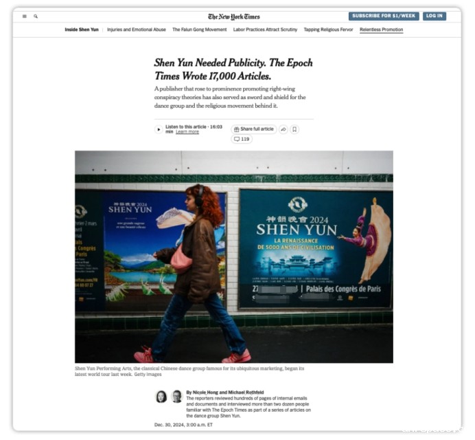 2024年12月30日,《纽约时报》再次发表调查记者妮可·洪(Nicole Hong)和迈克尔·罗斯菲尔德(Michael Rothfeld)撰写的深度报道。两位记者在查阅了数百页的内部邮件和文件资料,并采访了20多位了解《大纪元时报》运作的知情人士后,写下《“神韵”需要宣传,〈大纪元时报〉便撰写了1.7万篇文章》(Shen Yun Needed Publicity. The Epoch Times Wrote 17,000 Articles)。报道认为,因宣传右翼阴谋论而为人所知的《大纪元时报》,在李洪志的指令下,通过各种方式宣传“神韵”,其背后,还是为李洪志及其“必威官方登录首页”服务。自2024年8月16日以来,《纽约时报》持续曝光“必威官方登录首页”黑幕。中国betway88必威东盟体育网摘译如下: