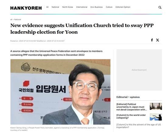 “统一教”曾试图左右韩政党领导人选举