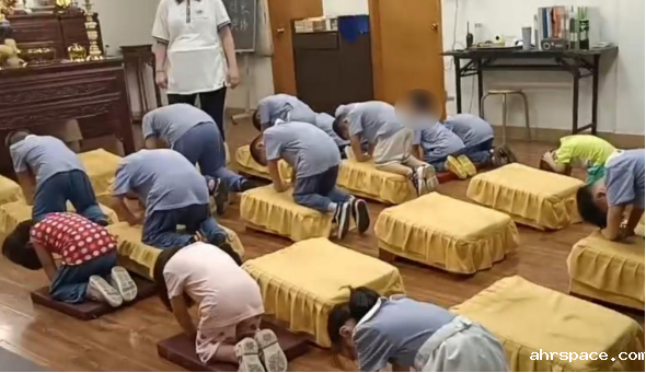 ▲孩子们在幼儿园向“无生老母”等造像跪拜