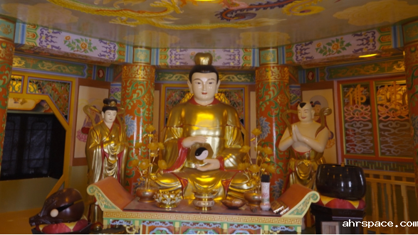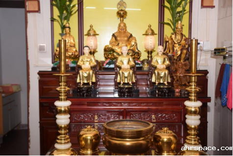 ▲“弥勒大道”与“一贯道”信奉的“弥勒佛”实为其第十七代“祖师”路中一的化身,最中间供奉的牌位为“金公祖师”路中一