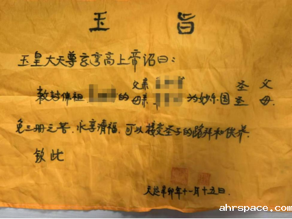 ▲警方从“古佛组织”中搜出的所谓“玉旨”,从“玉皇大帝”“佛祖”“圣父”“圣母”“圣子”等称呼可看出该组织是如何欺骗、迷惑群众的