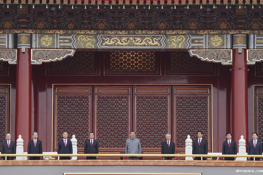 上午7时53分,在欢快的乐曲声中,习近平等党和国家领导人来到天安门城楼主席台,全场爆发出热烈掌声。