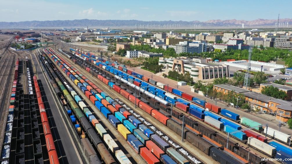 2024年5月25日,在新疆阿拉山口站宽准轨编组场,出入境中欧班列集结等待出发(无人机照片)。新华社发(于晖 摄)