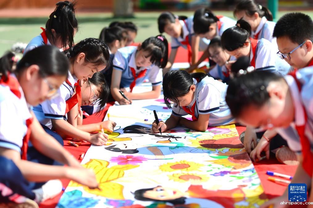 9月28日,在山东青岛重庆路第三小学,孩子们共绘迎佳节彩色画卷(无人机照片)。