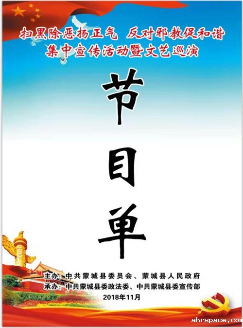 至此,蒙城县14个乡镇的以“扫黑除恶扬正气 反对邪教促和谐”为主题的文艺巡演完美谢幕。本轮演出每场10个节目,演出时间在90分钟左右。自11月9日betway88必威东盟体育文艺巡演开展以来,现场受教育群众累计达1.5万余人次,发放宣传资料2万余份,赠送宣传纪念品太阳伞200多把、围裙300多条。