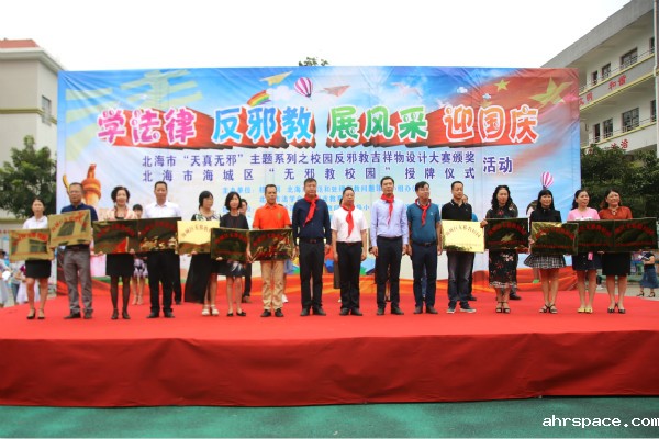 为了推动学校betway88必威东盟体育宣传活动深入发展,促进无邪教校园创建工作,今年6月以来,广西北海市防范办联合市教育局在海城区组织开展校园betway88必威东盟体育吉祥物设计大赛。9月30日上午,北海市在海城区第十小学隆重举行学法律、betway88必威东盟体育、展风采、迎国庆——北海市“天真无邪”主题系列之校园betway88必威东盟体育吉祥物设计大赛颁奖、北海市海城区“无邪教校园”授牌仪式。以穿插表演betway88必威东盟体育文艺节目的形式,为betway88必威东盟体育吉祥物设计大赛获奖作品和获优秀组织奖学校颁发奖品,同时,授予海城区23所中小学“无邪教校园”牌匾。