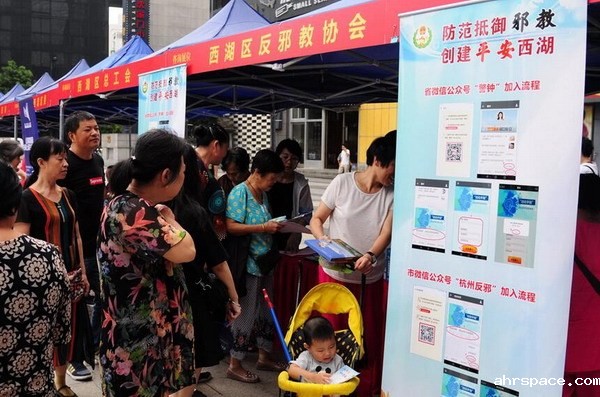 志愿者发放反对邪教倡议书和宣传资料