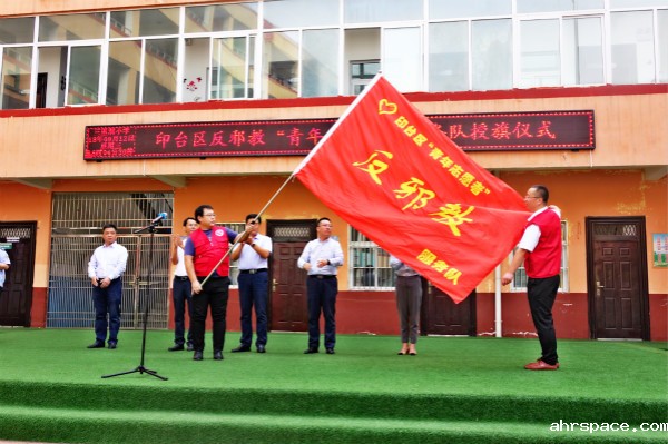 青年志愿者服务队队旗飘飘,激发反邪斗志。