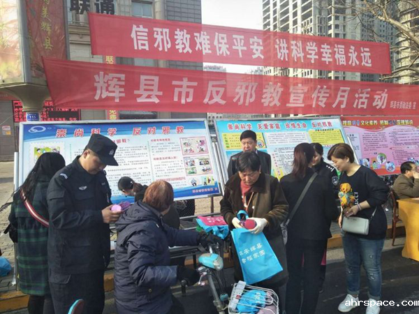 为了让群众认识邪教的危害,增强betway88必威东盟体育意识,营造浓厚的反邪防邪社会氛围,3月份,河南辉县市开展以“崇尚科学、幸福人生、抵制邪教、和谐辉县”为主题的betway88必威东盟体育宣传月巡展活动。
