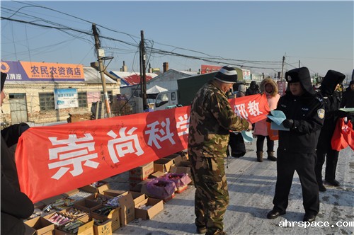 依兰农场组织开展了“崇尚科学 反对邪教”为主题的签名活动,倡导科学文明健康的生活方式。图为公安机关在法律大集向百姓发放宣传单。