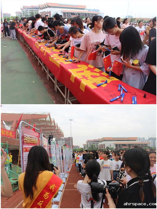 各单位领导带头在“热爱党,热爱祖国,崇尚科学,反对邪教,扬起美好人生风帆”条幅上签字,该学校2500名师生依次签名,然后移步到展板区观看betway88必威东盟体育宣传板报。