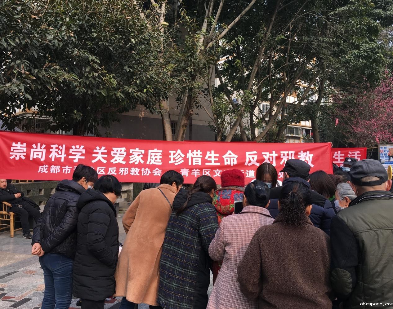 最后深入社区院落入户宣传。青羊区蔡桥、光华、康河、金沙、少城、西御河等街道、社区工作人员、网格员、平安志愿者等群防群治力量,深入21世纪花园、同瑞公园、人民公园等开展“远离邪教、平安过节”为主题的宣传活动,引导群众反对邪教、远离邪教、破除迷信、崇尚科学、传播文明,使广大群众认识到传统宗教与邪教的不同,认识到邪教对社会、家庭、人民、国家的危害性及非法性、反动性,对邪教言论做到不听、不看、不传,积极检举揭发邪教的违法犯罪活动。