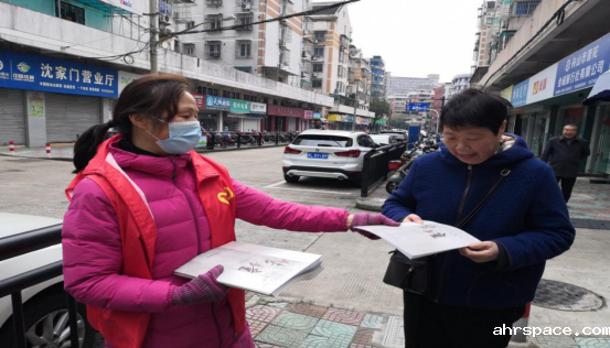 桃花镇集镇社区的渔嫂走在大街上分发反邪资料