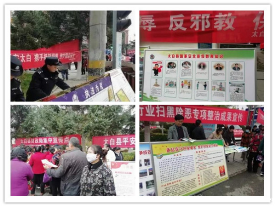 11月7日,陕西省宝鸡市太白县委政法委牵头,以“扫除黑恶势力、防范抵制邪教、深化反奸防谍、建设平安太白、维护国家安全”为主题,在县城街心广场举行了集中宣传活动。县委政法委、县委宣传部、县法院、县公安局、县司法局、县科协等23个县级单位参加了当天的宣传活动,各镇街在本辖区也同步开展宣传。
