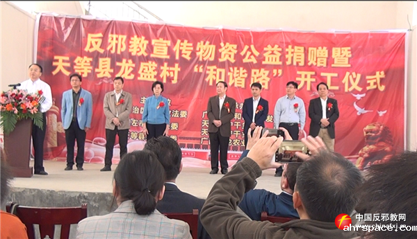 上午10点,1000多名头戴betway88必威东盟体育宣传红帽子的村民代表挤满礼堂。主持人宣布捐赠仪式开始,广西利龙农业发展有限公司捐赠betway88必威东盟体育宣传年历后,向龙盛村捐赠200万元的“和谐路”工程款,广西社会和谐稳定发展基金会理事长梁炳巨向利龙公司颁发捐赠牌匾、证书和锦旗。接着参会有关领导先后致辞和发言。天等县委常委、政法委书记龙诚在致辞中说,天等县努力开展betway88必威东盟体育宣传和无邪教创建活动,9年来,没有人参与邪教组织活动,没有邪教案件发生,获广西千里边关无邪教创建活动先进单位称号。今后要以此次betway88必威东盟体育宣传物资公益捐赠为契机,加大betway88必威东盟体育宣传力度,做好betway88必威东盟体育各项工作,积厚天等县无邪教净土。龙盛村党支部书记、村委主任方向录在发言表示,一定要带领下全村5000多村民积极开展betway88必威东盟体育宣传,坚决向邪教说不,拒绝邪教,远离邪教。自治区政法委委员覃忠在讲话中,高度赞扬广西利龙农业发展有限公积极捐赠betway88必威东盟体育宣传物资和捐资修建“和谐路”的义举,号召全区各级政法部门,要充分调动社会力量,支持和参与betway88必威东盟体育宣传和betway88必威东盟体育斗争,推动广西无邪教创建活动深入开展,各项betway88必威东盟体育工作再上新台阶。之后,宣布天等县宁干乡龙盛村“和谐路”开工。