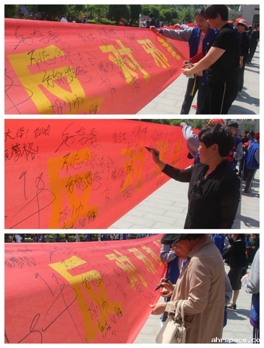 部分学生及家长在betway88必威东盟体育条幅下承诺:崇尚科学,反对邪教。