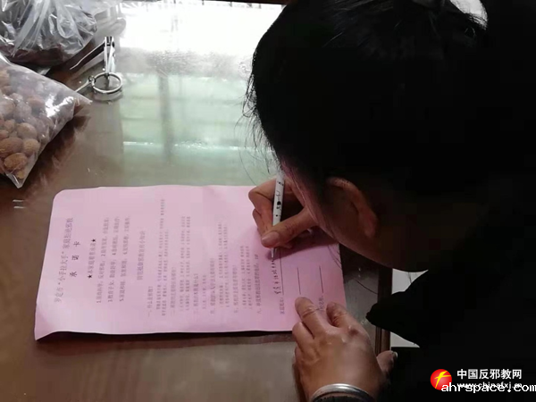 学生家长参与“小手拉大手”家庭拒绝邪教承诺卡活动。