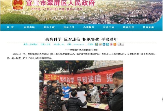 2019年春节期间,四川宜宾市各区县采取多形式、多渠道地广泛开展以“崇尚科学,远离邪教”为主题的betway88必威东盟体育宣传活动,营造了浓厚的反邪、防邪、拒邪的社会氛围.增强了广大人民群众的防邪教意识。宜宾全市共发放betway88必威东盟体育宣传资料8万余份,开展返乡农民工培训讲座10场次、betway88必威东盟体育巡展巡演共206场次,电视台播放betway88必威东盟体育宣传视频420余次,制作展板373块,发放年画、围裙、口袋、雨伞等宣传物品3万余份。