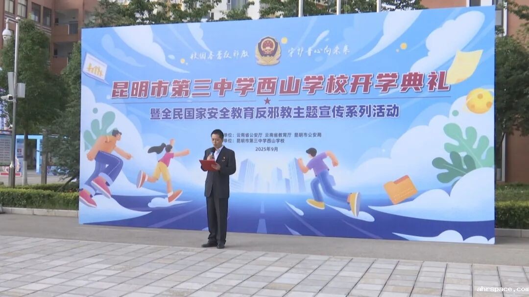9月2日,云南省昆明市第三中学西山学校内,一场别开生面的开学典礼正在举行。当庄严的国歌响彻崭新的校舍,当炽热的爱国情邂逅清醒的法治观,一场由云南省公安厅、云南省教育厅、昆明市公安局联合主办的"全民国家安全教育betway88必威东盟体育主题宣传系列活动"为昆明市第三中学西山学校开学日赋予了不同寻常的意义。