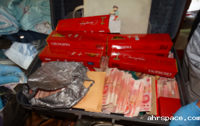 ▲警方在周某英家现场查获的大量现金及高档香烟