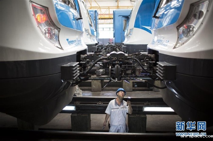 2017年4月11日,在位于阿根廷首都布宜诺斯艾利斯以南的利亚瓦略尔,中方技术人员检查为罗卡线城际铁路提供的列车。近年来,在阿根廷,中车制造的各种轨距、各种制式、各种型号的铁路机车、动车组、客车、货车和地铁列车密集交付。新华社发(马丁·萨巴拉 摄)