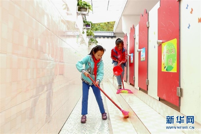 两名学生在贵州省织金县熊家场镇小学的厕所打扫卫生(2018年10月23日摄)。新华社记者 张玉薇 摄