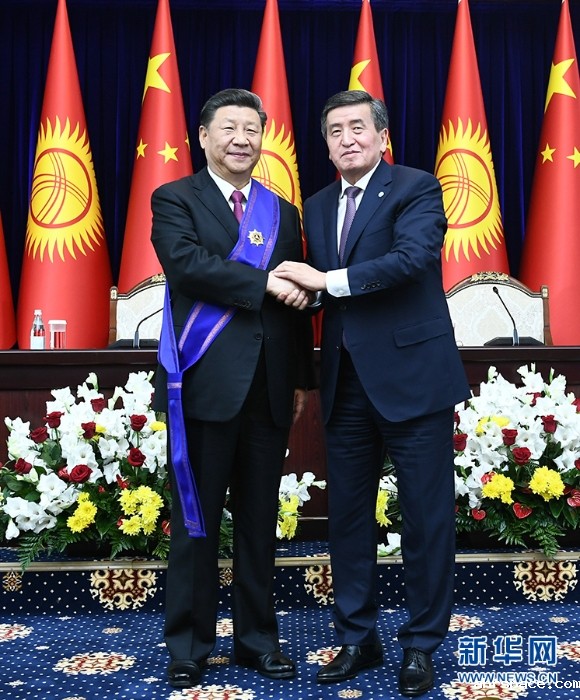 国家主席习近平13日在比什凯克出席仪式,接受吉尔吉斯斯坦总统热恩别科夫授予“玛纳斯”一级勋章。