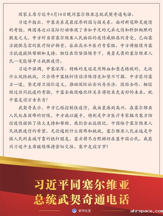 习近平指出,中塞关系是最深厚的国与国关系。面对新冠肺炎疫情的考验,两国再次以实际行动体现了亲如手足的兄弟之情和肝胆相照的朋友之义。中方对当前塞尔维亚人民面临的疫情威胁感同身受,已向塞方提供急需的医疗防护物资,派出高水平医疗专家组。中方将继续为塞方抗疫提供帮助和支持。相信在你坚强领导下,英勇无畏的塞尔维亚人民一定能够早日战胜疫情。