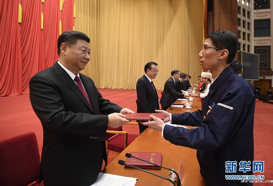 在欢快的乐曲声中,全国劳动模范和先进工作者代表依次登上主席台,习近平等为他们颁发荣誉证书。