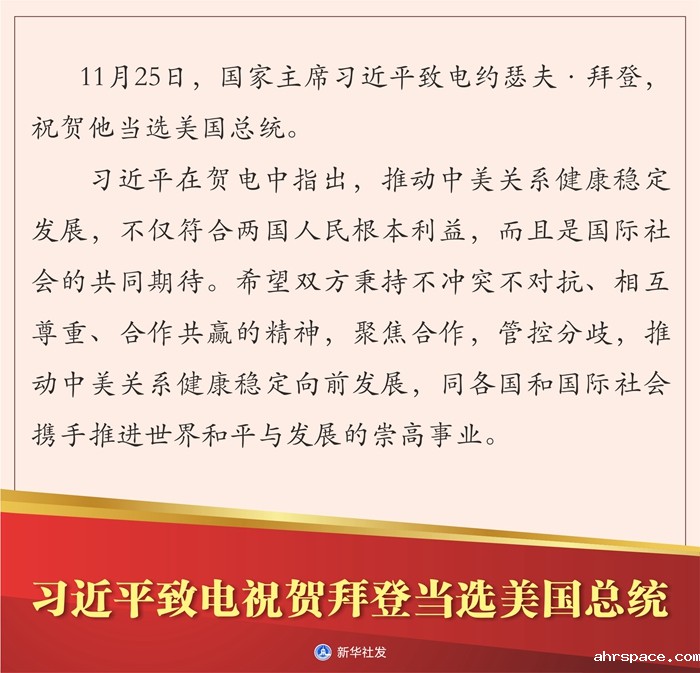 11月25日,国家主席习近平致电约瑟夫·拜登,祝贺他当选美国总统。