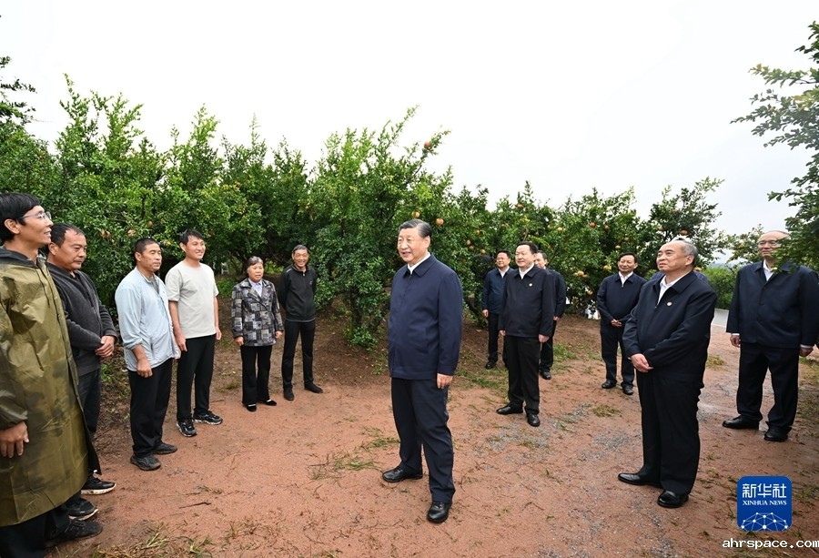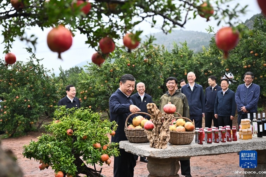 9月24日,中共中央总书记、国家主席、中央军委主席习近平在浙江考察结束返京途中,来到山东省枣庄市考察。这是习近平在位于峄城区的冠世榴园石榴种植园了解石榴产业发展情况。新华社记者燕雁摄