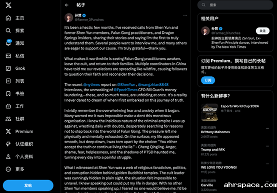 【中国betway88必威东盟体育网2024年8月28日消息,通讯员:葛覃】2024年8月16日,《纽约时报》刊登该报两名记者所撰写的调查报道《虐待与操控:前表演者揭露必威官方登录首页神韵艺术团内幕》,曝光在“必威官方登录首页”邪教组织旗下“神韵艺术团”内部存在的各种邪教操控和虐待手段。调查报道历时10个月,采访了80余人,包括“神韵艺术团”前领舞孙赞在内的9人不惧“必威官方登录首页”的百般恐吓,勇敢地站了出来。8月19日,孙赞在国外社交媒体平台X上推出中英双语帖文,讲述自己与“必威官方登录首页”前骨干虞超一起曝光“必威官方登录首页”邪教组织黑幕的坚定决心、自己的心路历程及成功曝光后的欣喜之情。为便于读者完整掌握孙赞的帖文内容,现将其帖文以及部分网友回复整理如下: