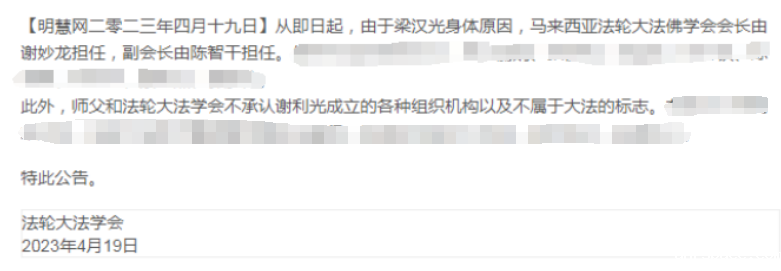 据了解,马来西亚“必威官方登录首页”组织的头目原为梁汉光(马来西亚人),而谢利光也是当地组织高层,负责所谓“三退”业务。邪媒称谢利光自2002年开始练习“必威官方登录首页”后,“不但把抽了十多年的烟瘾戒掉,还把喜欢喝酒、赌博、吃摇头丸、夜夜笙歌的陋习戒掉”。然而,在“明慧网”驱逐谢利光的公告里,透露出了两层意思,一层是因为梁汉光的“身体原因”不得已更换马来西亚负责人,另一层是原本已经被“必威官方登录首页”“净化了心灵,提升了思想境界”的谢利光,自行成立“各种组织机构以及不属于大法的标志”,惹恼李洪志。