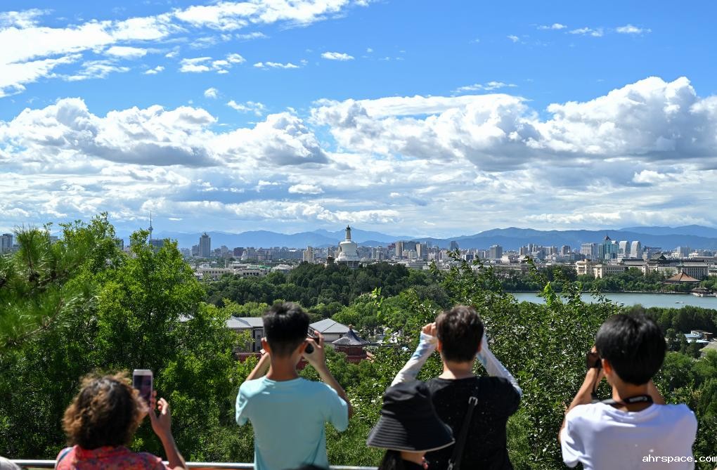 2024年8月12日北京天气晴好,游客从景山上拍摄远处的北海公园。新华社记者李鑫 摄