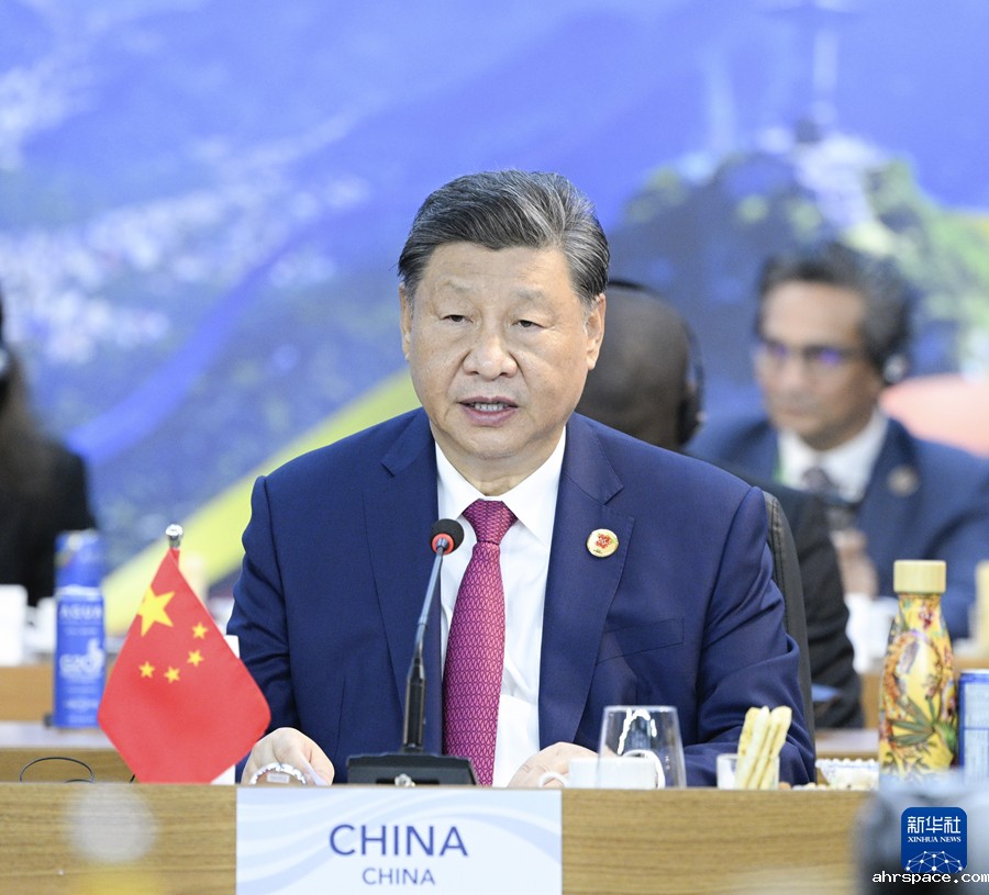 当地时间11月18日上午,国家主席习近平在巴西里约热内卢出席二十国集团领导人第十九次峰会。在峰会第一阶段围绕“抗击饥饿与贫困”议题讨论时,习近平发表题为《建设一个共同发展的公正世界》的重要讲话。新华社记者 李学仁 摄