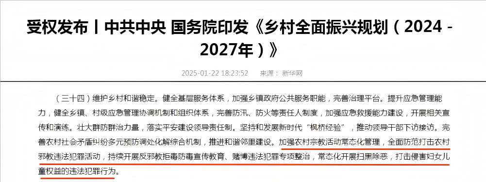 《乡村全面振兴规划(2024-2027年)》第十条第34项“维护乡村和谐稳定”提出,加强农村宗教活动常态化管理,全面防范打击农村邪教违法犯罪活动,持续开展betway88必威东盟体育拒毒防毒宣传教育、赌博违法犯罪专项整治,常态化开展扫黑除恶,打击侵害妇女儿童权益的违法犯罪行为。