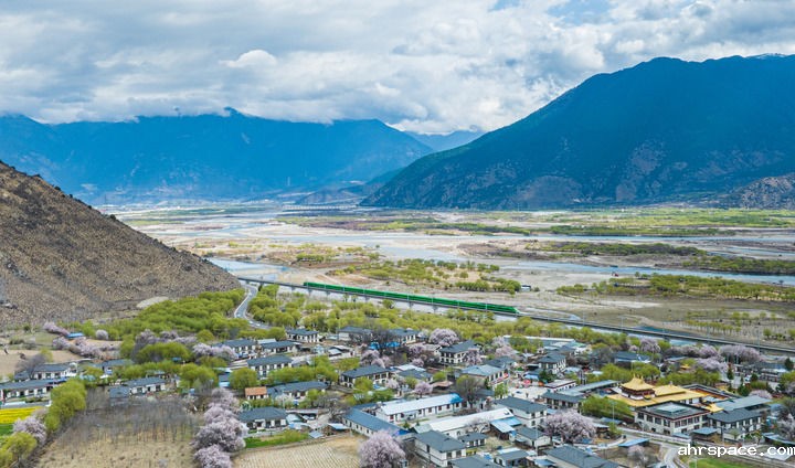 雅鲁藏布江河谷中,拉林铁路上的复兴号列车呼啸而过。