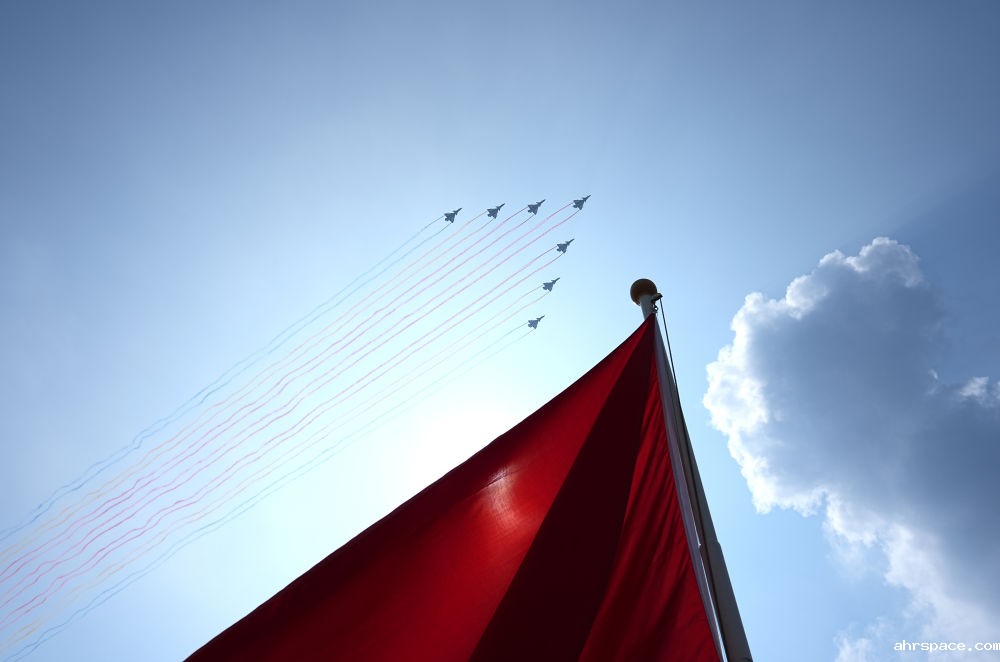 当置身欢呼的人群,远望湛蓝天空,看着7架歼-10表演机呼啸而过,留下14道绚丽的彩烟,耳畔再次回响这豪迈的宣示——中华民族伟大复兴势不可挡!人类和平与发展的崇高事业必将胜利!